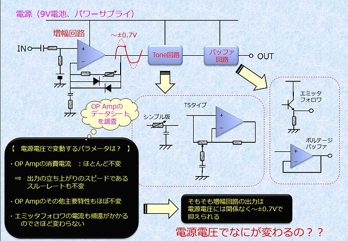 このように、電気的に考察すると電源電圧でオーバードライブの音が変わるとは考えにくいんです・・・。